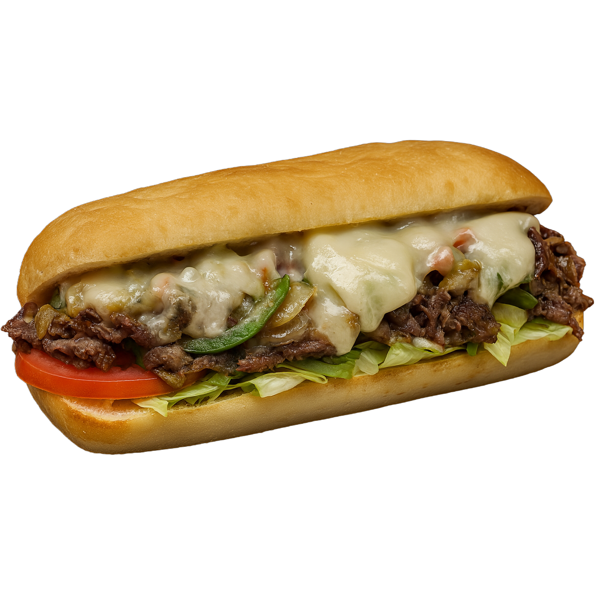🥩 Thin-sliced steak grilled with melted cheese, sautéed onions, and bell peppers, all tucked into a warm artisan-style roll — rich, savory, and loaded with classic Philly flavor.