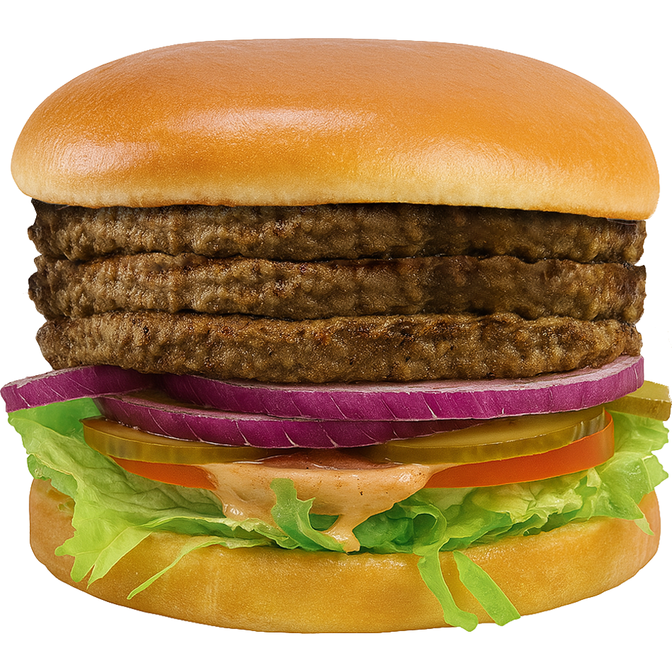 🍔 Triple Burger: Three juicy beef patties stacked tall with fresh lettuce 🥬, tomato 🍅, red onion 🧅, crunchy pickles 🥒, and our signature house dressing — all served inside a soft, toasted seedless bun.